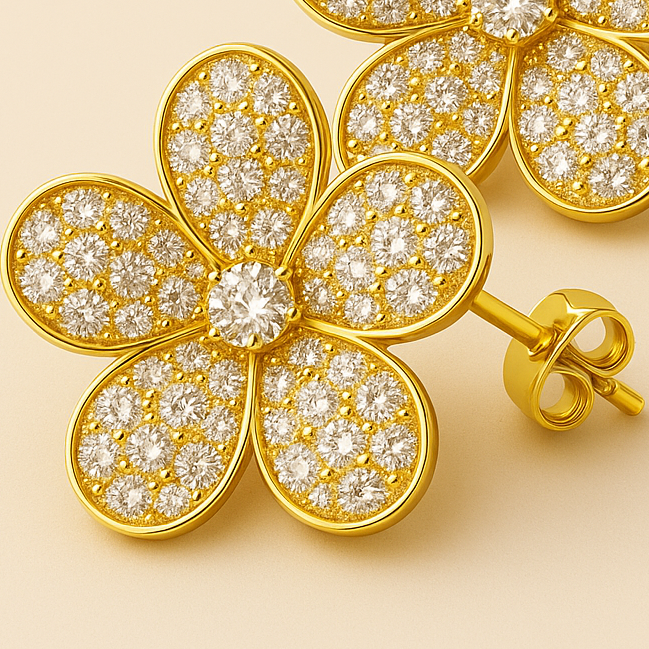 Design a fiore con 5 petali bombati ricoperti da micro-zirconi super brillanti