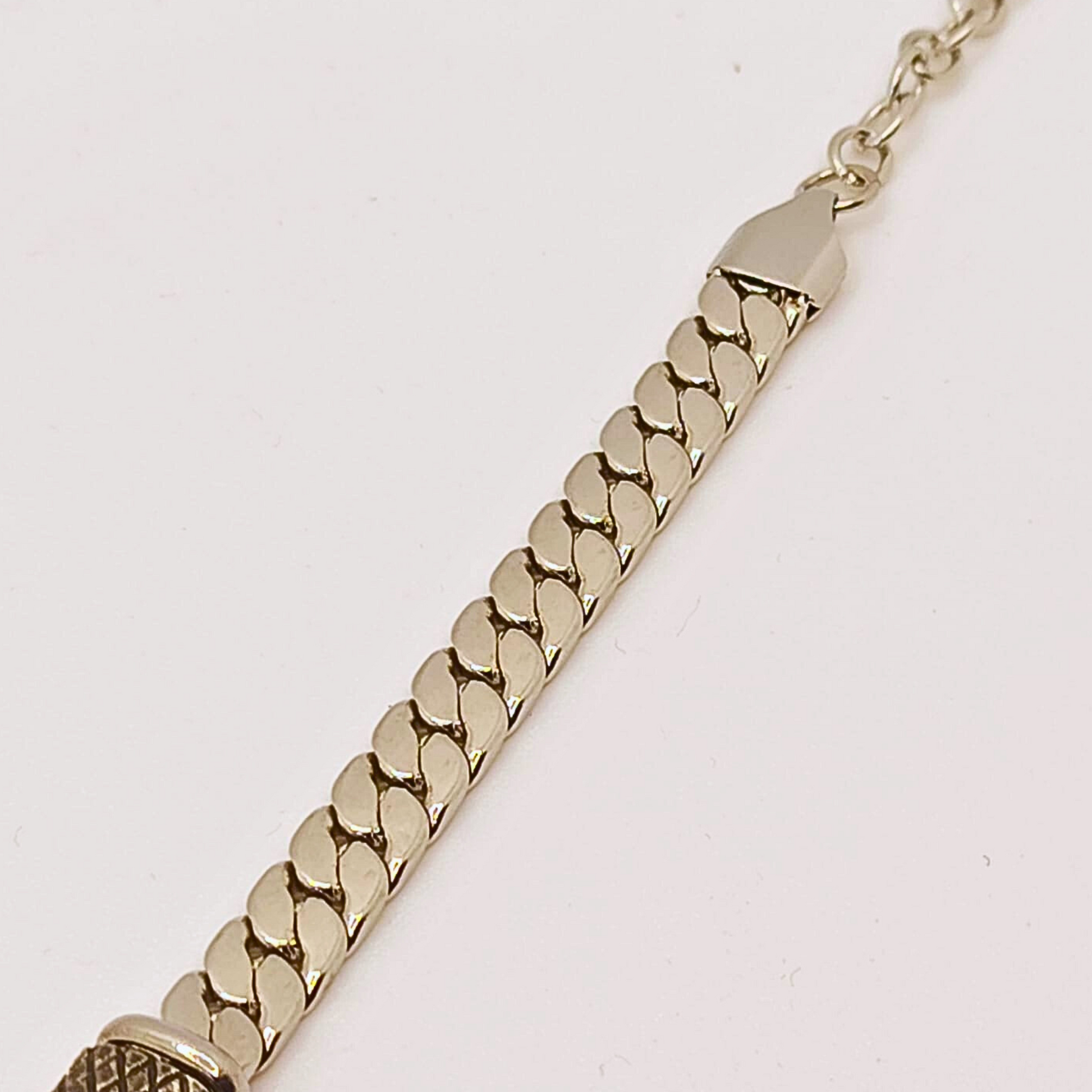 La sua maglia argentata si unisce a una placca centrale dorata e a dettagli laterali finemente lavorati, creando un equilibrio perfetto tra eleganza e carattere.