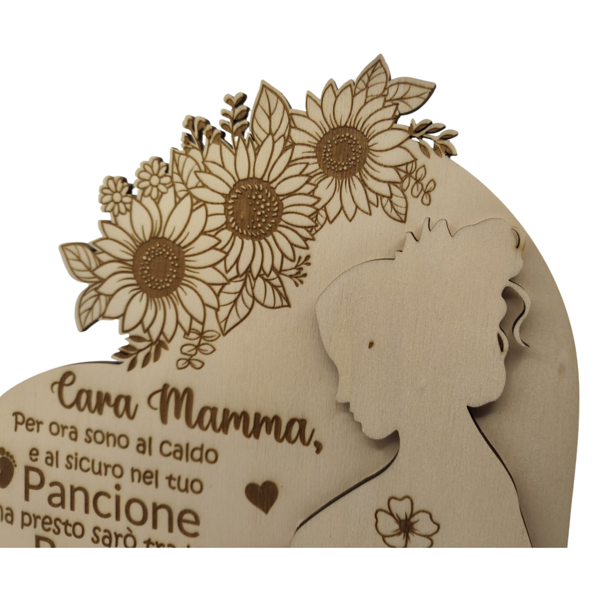 Un regalo emozionante per una futura mamma! Questa decorazione in legno personalizzata è un dolce ricordo della gravidanza, con una dedica speciale e un cuore intagliato per inserire l'ecografia. Realizzata con incisioni raffinate e dettagli floreali, celebra l'attesa con parole cariche di amore.