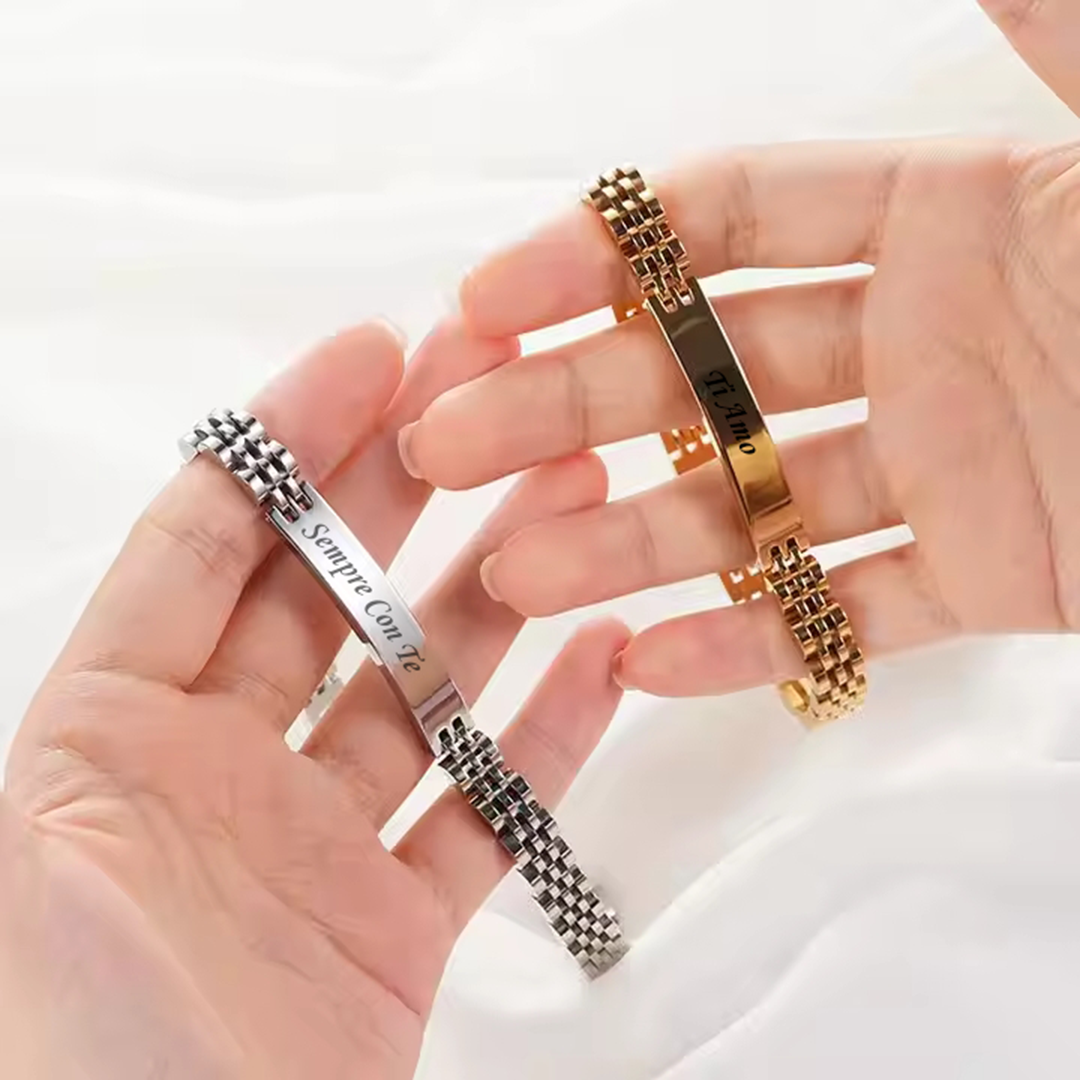 Scopri l'eleganza senza tempo e la possibilità di esprimere la tua unicità con il bracciale Legame Eterno. Realizzato con l'iconica maglia jubilee in pregiato acciaio inossidabile ASII 316L, questo splendido gioiello è disponibile nelle raffinate finiture oro e argento. Rendi il tuo Legame Eterno ancora più speciale grazie alla nostra opzione di personalizzazione con incisioni uniche. Perfetto come simbolo di un legame indissolubile o come espressione del tuo stile personale. Esplora la nostra collezione e crea il tuo gioiello indimenticabile.